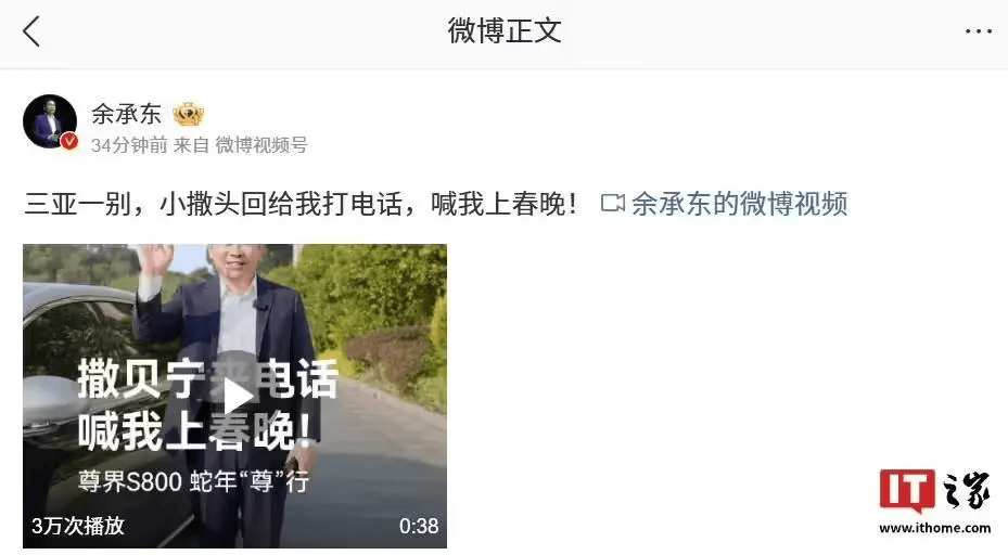 视频中,余承东在挂断电话后,对着镜头笑称,今年的春晚将有一位特别的“演员”——尊界S800。这款汽车以其独特的智能技术和豪华设计,成为了此次春晚的焦点之一。